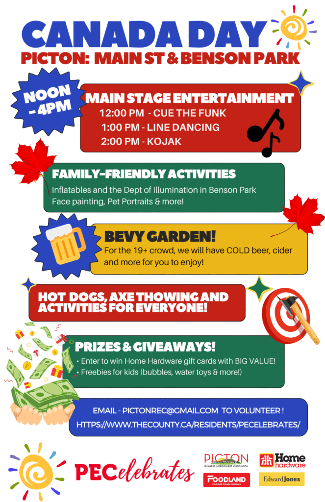 Canada Day in Picton is presented by the Picton Recreation Committee. Come join in the fun with activities for all ages downtown Picton from 12 pm to 4pm! This is a Canada Day celebration for everyone! There will be live music and fun activities for all ages! Everyone is welcome at this free community event!